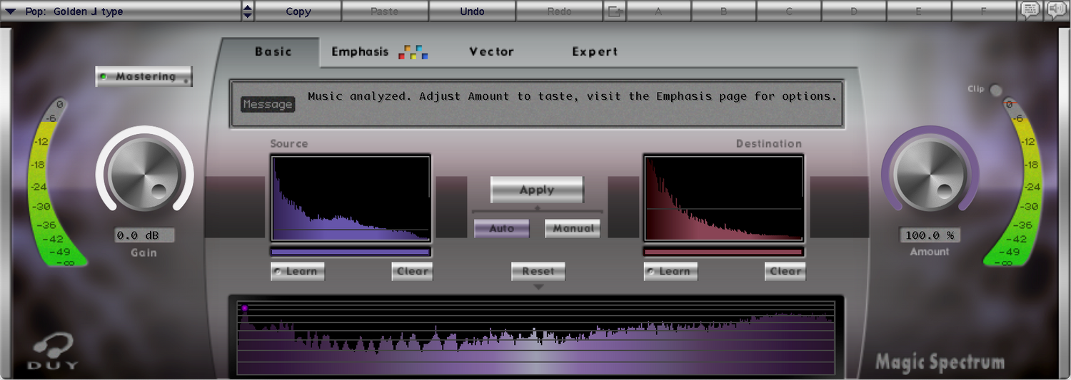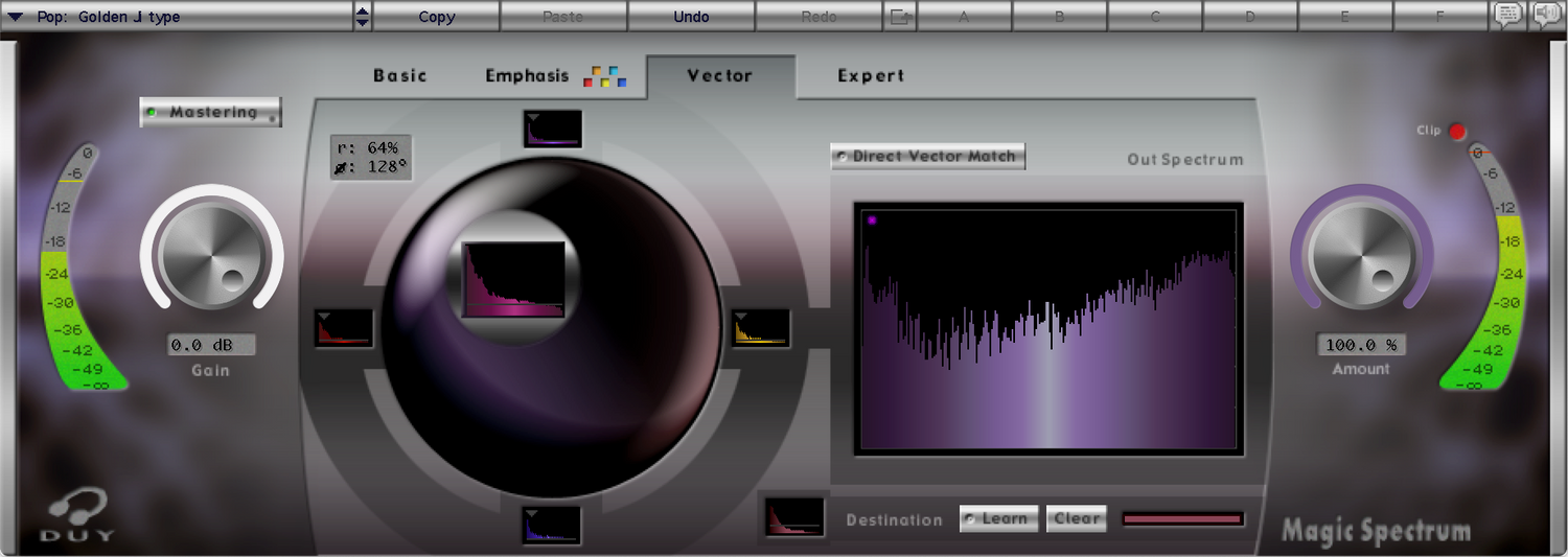 Hvis du ikke har noen sanger å bruke som referanse, kan du også laste inn en av de mange inkluderte forhåndsinnstillingene. Disse inkluderer analyser fra noen av de beste innspillingene noensinne eller fra spesifikt klingende masters. Magic Spectrum kan også brukes som en EQ, eller du kan til og med laste inn 4 forskjellige responser og vektorkombinere disse responsene på den måten du finner passende. Dette gir deg muligheten til å legge til “mer karakter” fra én lyd eller mer fra en annen...