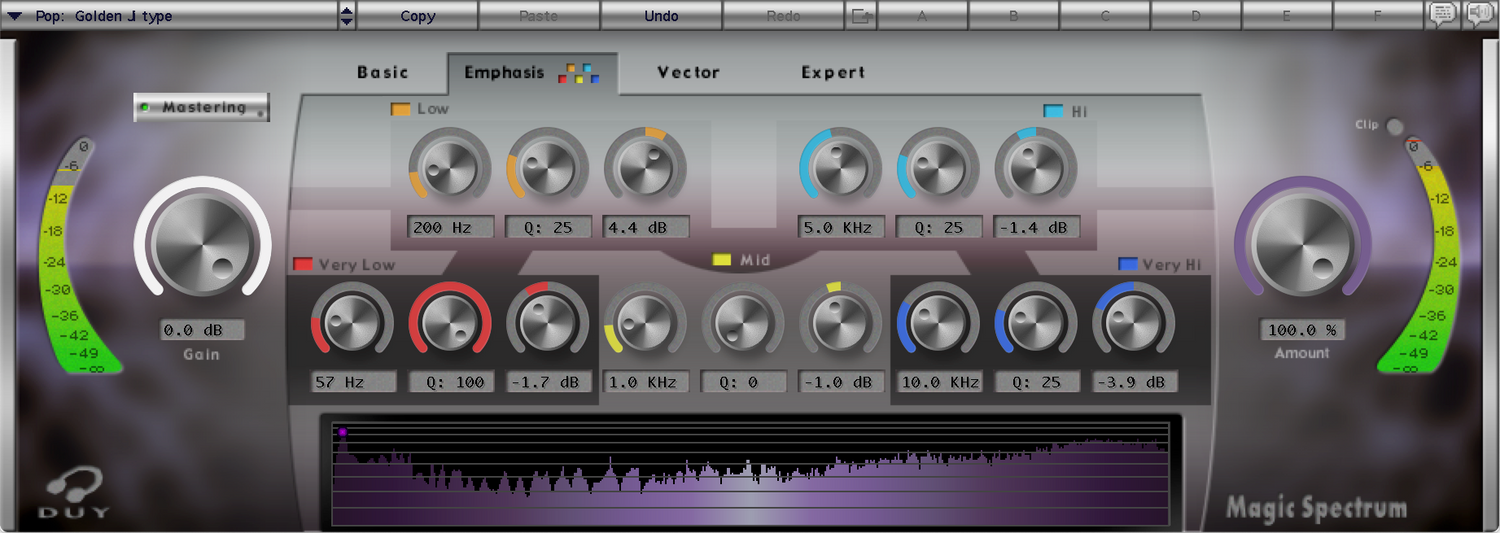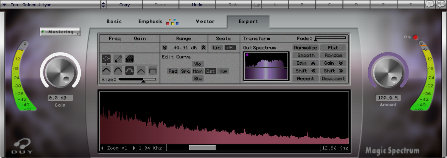 Duy's Magic Spectrum gir deg muligheten til å utføre grunnleggende operasjoner som å matche spektret av et lydstykke med et annet; det er det perfekte verktøyet for ADR. Det gjør det også mulig for deg å endre frekvensinnholdet selv med spesifikke redigeringsverktøy.