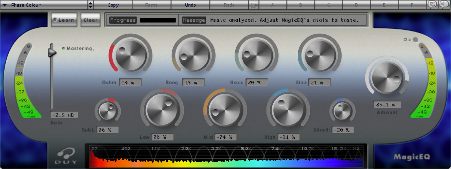 For å bruke Duy MagicEQ, trenger du bare å sette inn plug-in, spille musikken din og klikke på "LEARN"-knappen. Musikken din vil bli analysert i løpet av dette første steget, noe som resulterer i en auto-equalization. Du kan fortsatt endre mange parametere etter at EQ'ing har skjedd magisk. Dette er ingen standard EQ. Når MagicEQ har kjørt gjennom sangen og analysert den, er alt som gjenstår å justere og finjustere equalization, og deretter vil MagicEQ gjøre resten.