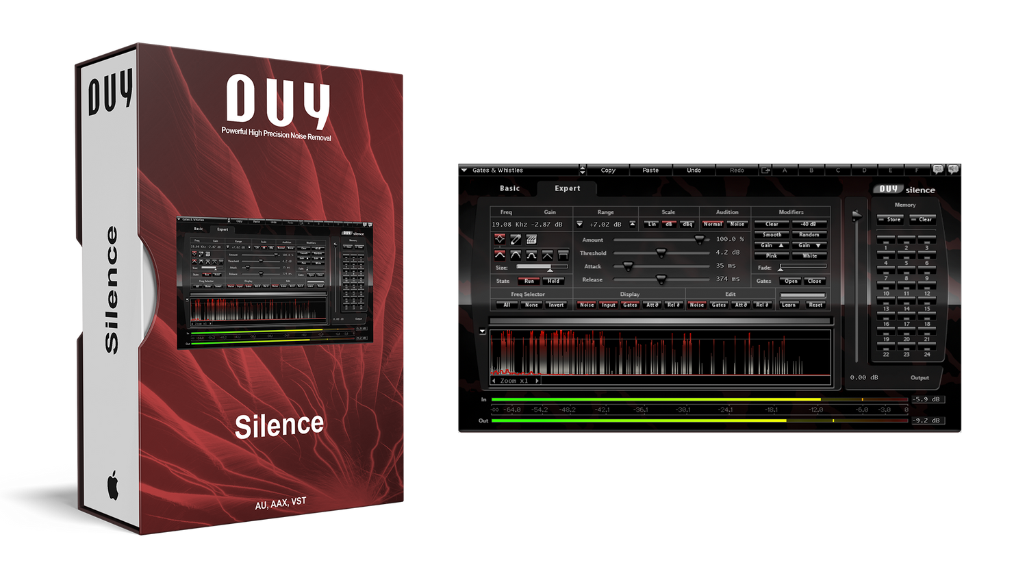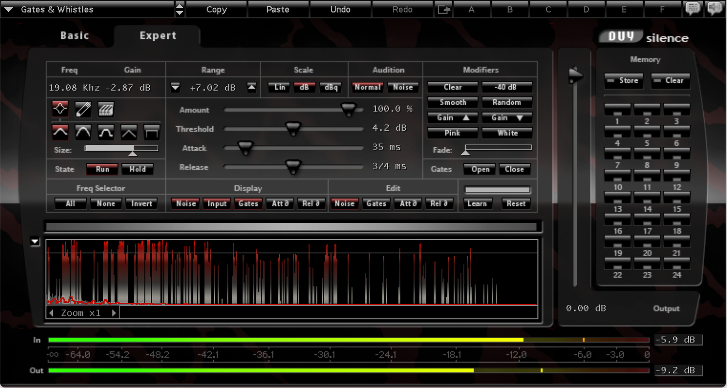 Den tidkrevende og arbeidskrevende oppgaven med å fjerne støy har nå blitt en svært effektiv og stressfri oppgave. Ta for eksempel et gammelt innspilt spor… Med Duy Silence, analyserer du bare støyen på det, setter angreps-, slipp- og terskelverdiene, og så er du ferdig!! For større kontroll kan du gå inn i "Avansert" modus, som lar deg endre støyportinnstillingene for hver av de over 1000 frekvensbåndene som er opprettet innen DUY Silence.