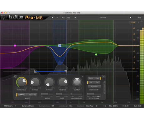- Fully customizable per band: threshold, range, attack, release, output gain, ratio, variable knee, lookahead (up to 20 ms), variable stereo linking, mid- or side-only processing, external side chain input, triggering on a separate frequency range