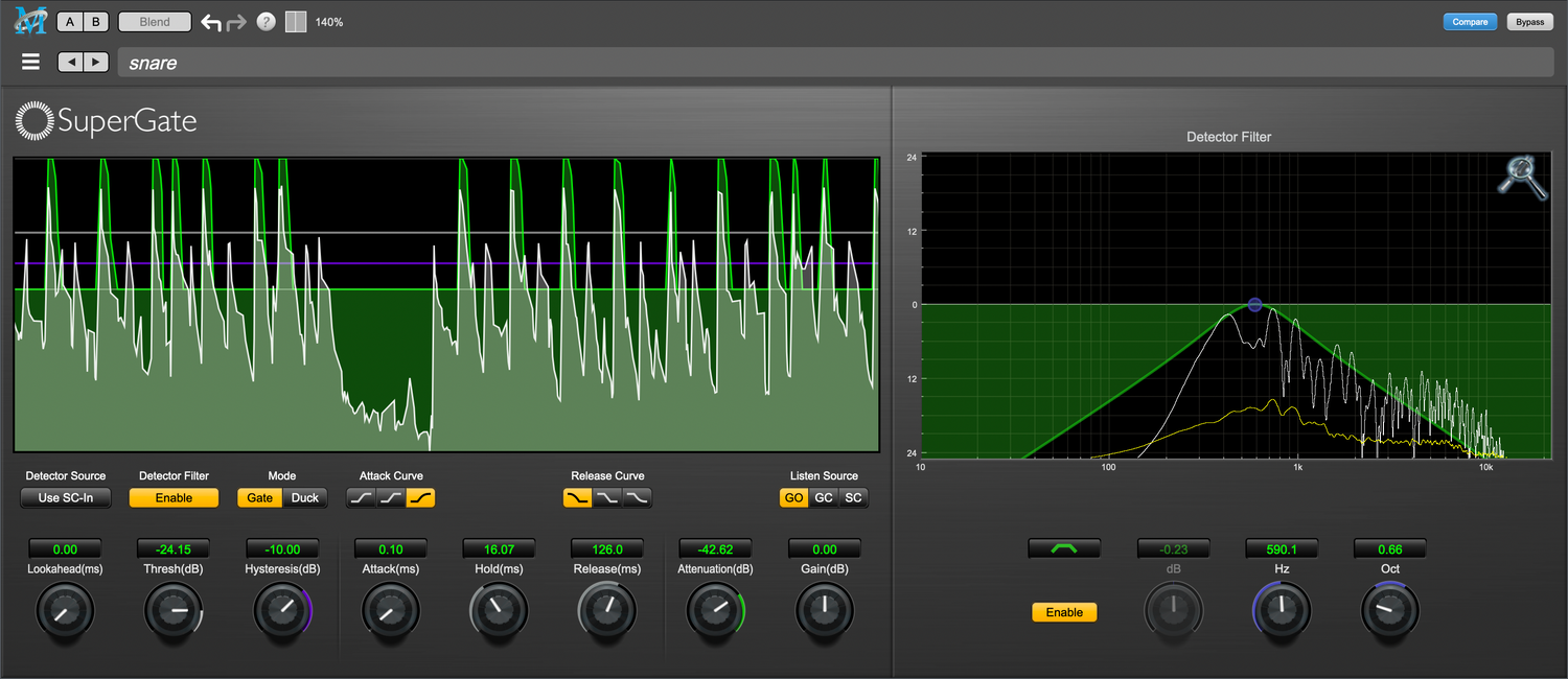 Ulikt andre porter, lar SuperGate deg tilpasse gate angreps- og frigivelsesforsterkningskurver nøyaktig til lyden du isolerer, mens du lytter, samtidig som du visuelt refererer til vår spesialiserte WYSIWYG-detektorvisning.