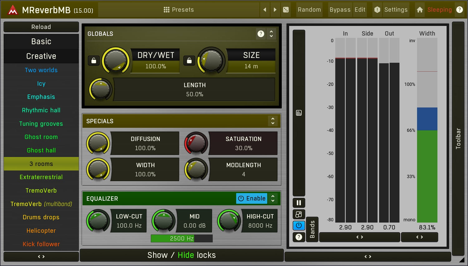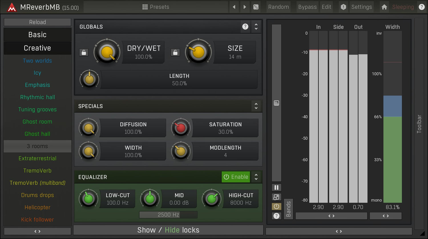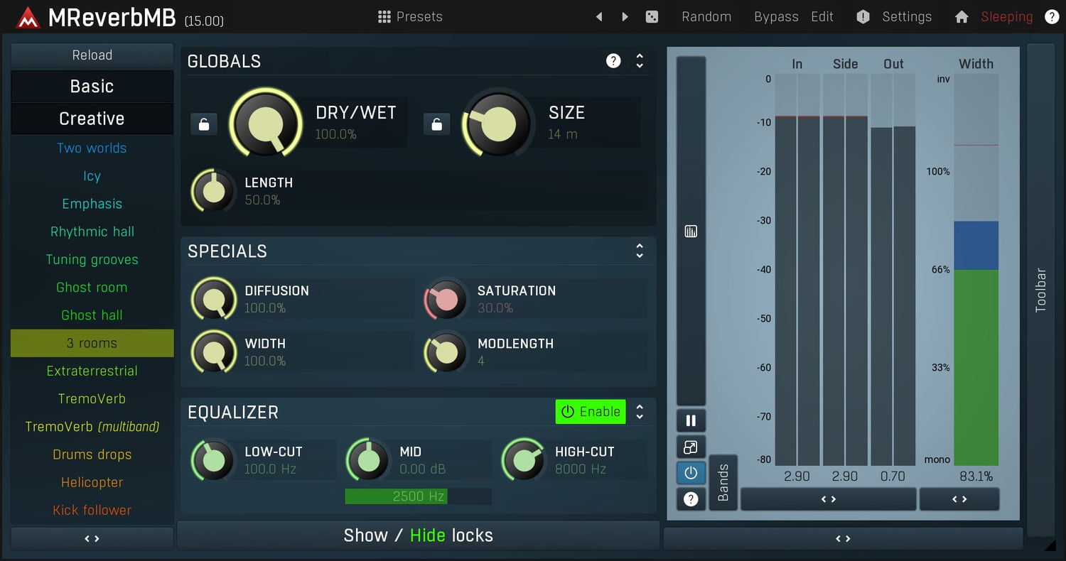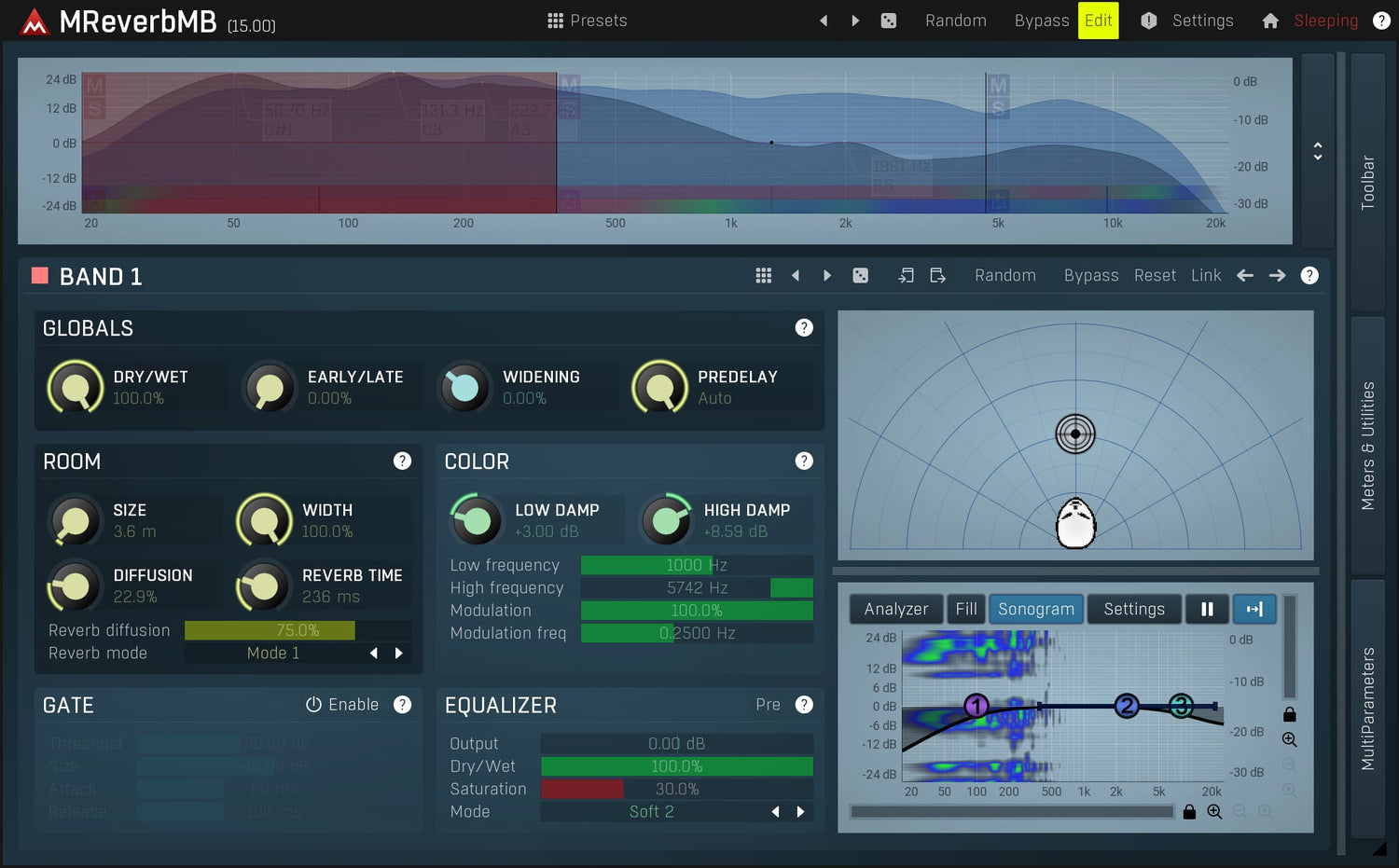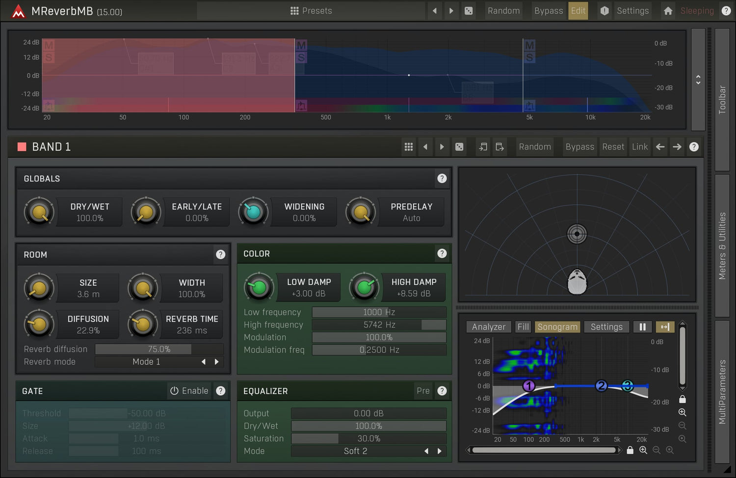 MReverbMB utvider mulighetene langt utover det som er vanlig for standard kvalitet reverb ved å la deg prosessere opptil 6 distinkte bånd samtidig.
