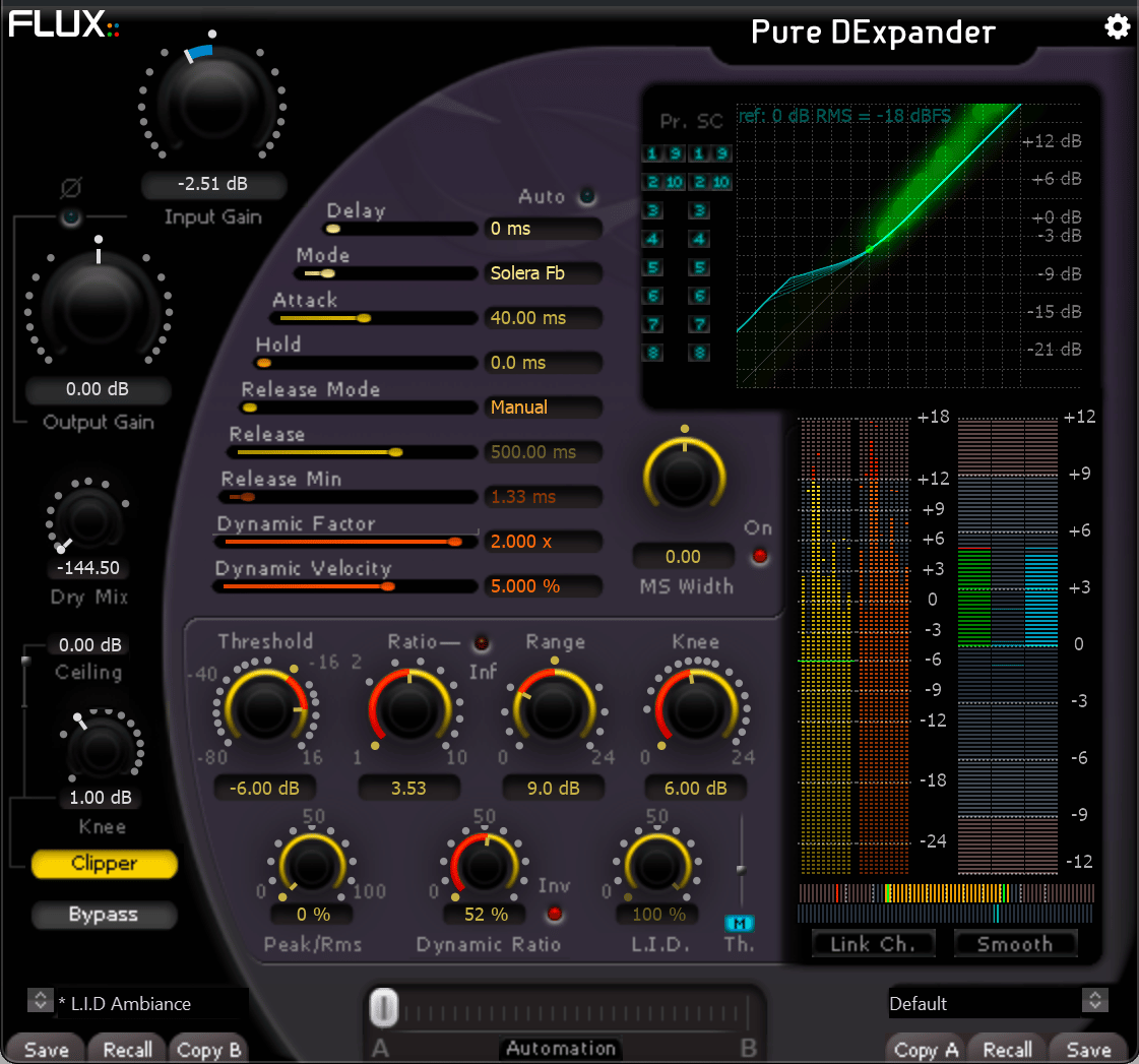 I tillegg til de vanlige kontrollene på en dynamisk prosessor; ratio, attack, release, tilbyr Pure DExpander kontroll over de grunnleggende egenskapene ved dynamisk behandling, alt sammen for å gi full kontroll over behandlingen selv i de mest krevende situasjoner ved hjelp av de angitte Envelope-, Time- og Detection-innstillingene.