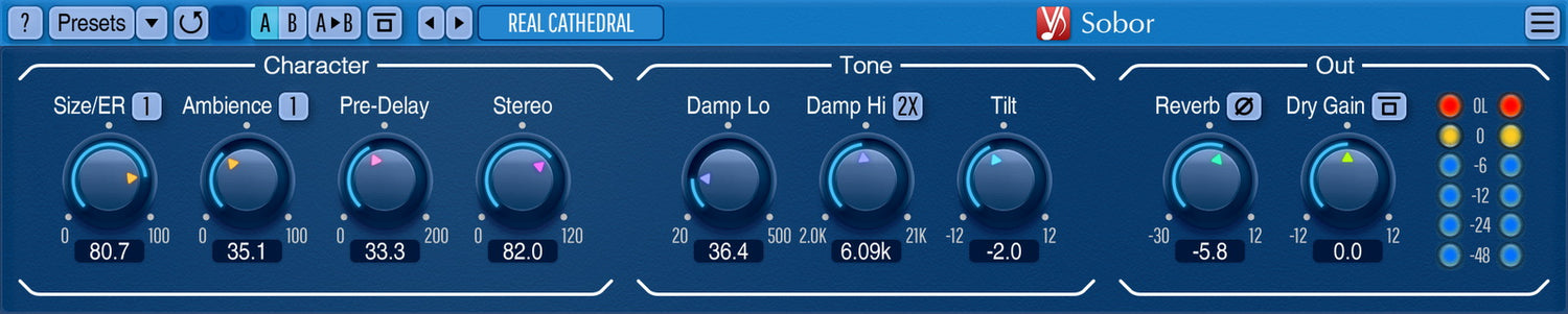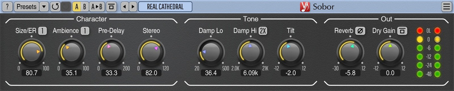Sobor er en stereo reverberasjonseffekt AU, AAX og VST-plugin for profesjonelle musikkproduksjonsapplikasjoner. Denne reverb-pluginen tilbyr et bredt utvalg av reverb-rom, mens den kun krever minimal innsats for å oppnå nyttige resultater. De halene som skapes av denne reverb, er veldig tette og produserer en veldefinert spatialisering. Siden reverben bruker en slags “true-stereo” algoritme, får panoreringseffektene en god stereo feltplassering. Vi mener at Sobor tilbyr noen av de mest frodige og bredeste reverb-halene som finnes på markedet.
