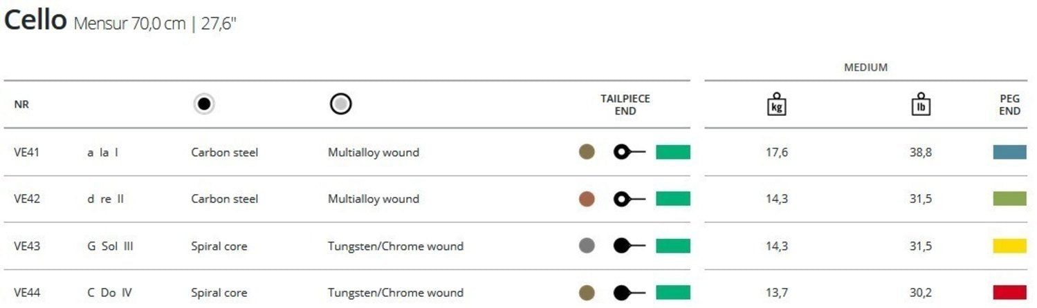 - A- og D-strenger: ståltråd, viklet med spesiallegering, medium spenning