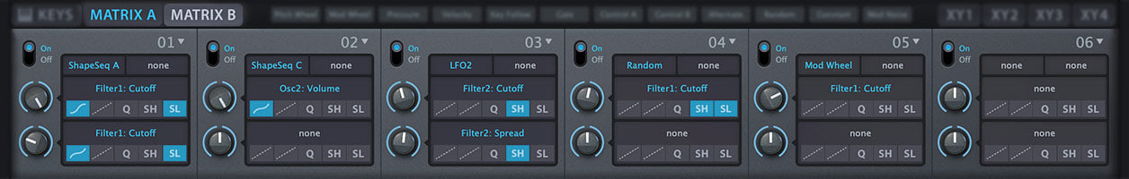 - 12x 2 matrix slots with modifiers for curvature, rectify, quantize, sample/hold, slew rate