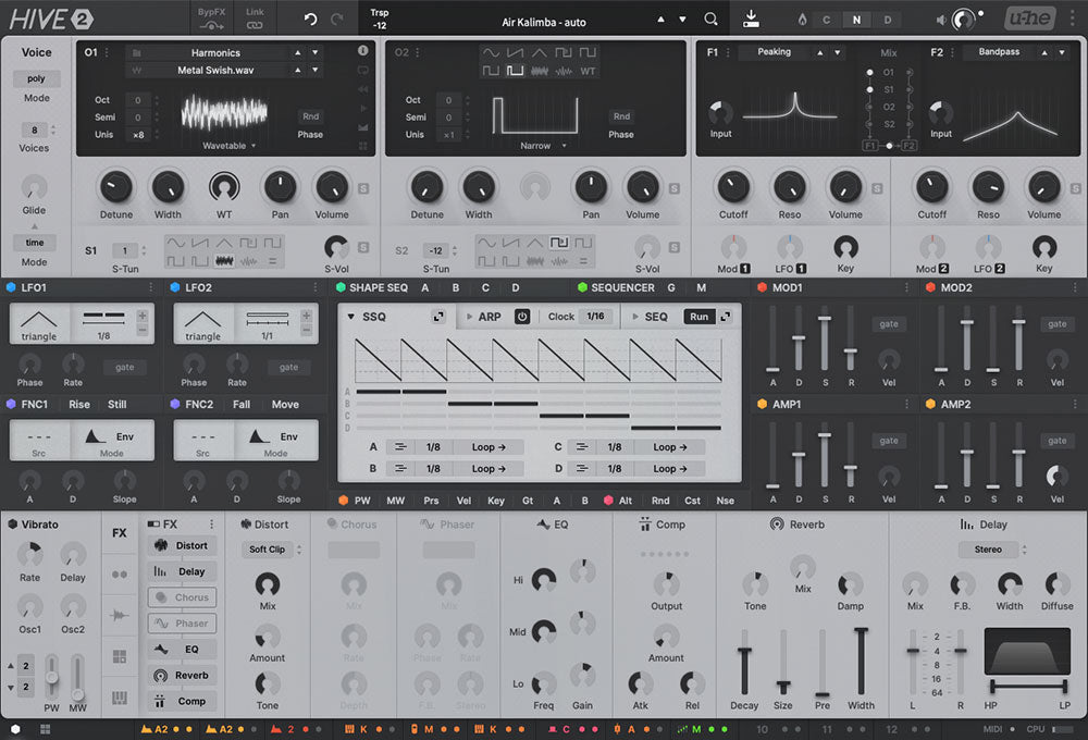 Under sitt stilige ytre lar Hive 2 deg gå så dypt som du vil. Legg til bevegelse og liv ved å bruke shape sequencer, eller ta opp, rotere og arpeggiere notesekvenser umiddelbart. Den 12-slot matrisen lar deg til og med modulere effektparametere, noe som oppfordrer deg til å utforske en helt ny verden av kreative alternativer. Med sin byttbare audio engine, fleksibel signalruting, wavetable-støtte og kvalitets effekter, sørger Hive 2 for at du kan få lyden du ønsker med minimal fuss.