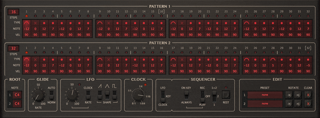Sequenceren i den originale maskinvaren kan ha vært et geni. Repro-1s versjon lar deg step-recorde to mønstre på opptil 32 noter hver, som også lagres med forhåndsinnstillingen og støtter kopiering/innliming av mønstre mellom forskjellige instanser av plug-in.