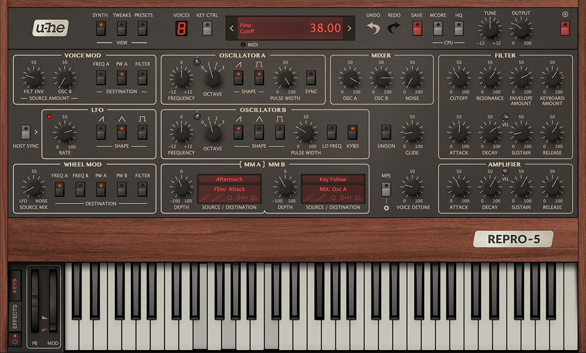Repro-5 deler mye sonic DNA med Repro-1, men tilfører nye smaker og egenskaper. Først: det er polyfonisk! Spill rike pads, form dem ved hjelp av det resonante lavpassfilteret, kjør den polyfoniske forvrengningsenheten så hardt du vil, og til slutt poler lyden din med fem innebygde effekter. Hold det frodig, eller gå for tykke detunede unison leads. Repro-5 tilfører nye dimensjoner til den kjente klassiske lyden samtidig som den holder analog autentisitet i fokus.