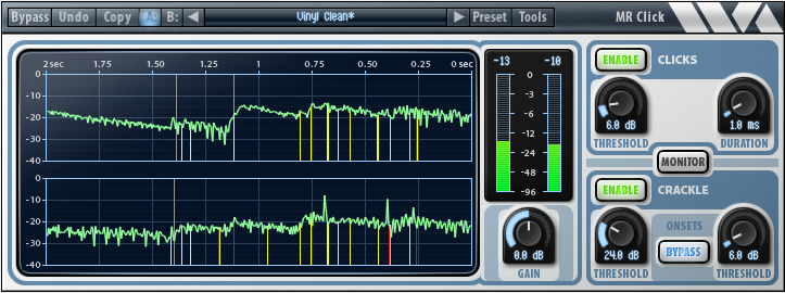 - Comprehensive stereo display of signal level, clicks, crackle, and onset events