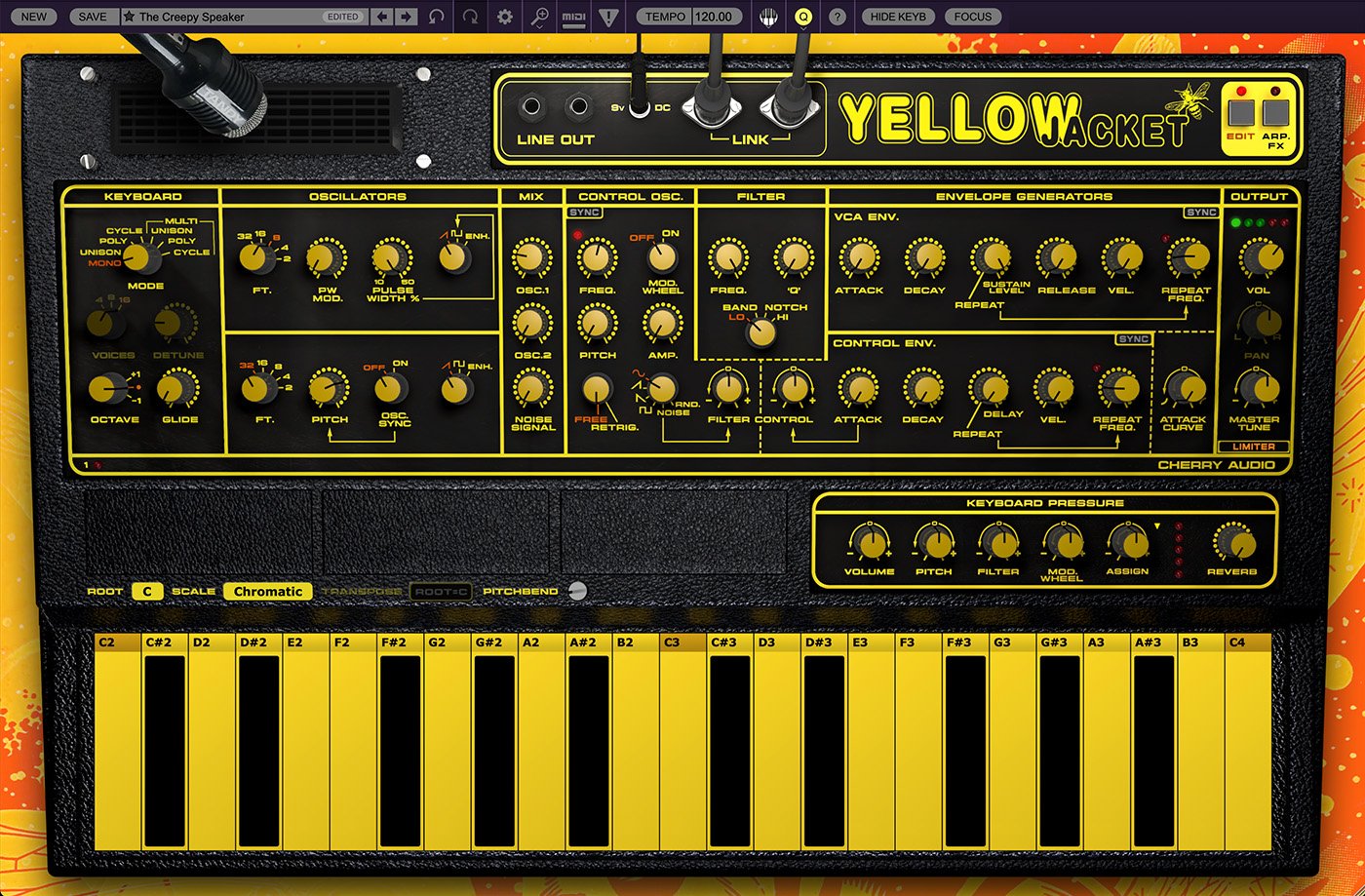 Yellowjacket synthesizer er en fantastisk verdi-pakket hyllest til den ærverdige Wasp synthesizeren, utgitt av det britiske synthselskapet EDP i 1978. Cherry Audio har gjenskapt den unike summende tonen og dronen til denne legendariske monofoniske, digital/analog hybrid, fra dens quirky oscillators til dens distinkte filter. Videre påvirket av den banebrytende ånden til sine oppfinnere, har vi lagt til flere innovative funksjoner til Yellowjacket, og gjenoppfunnet hva som kunne ha vært. Disse inkluderer elementer fra andre EDP-instrumenter, unison og 16-stemmig polyfoni, emulering av Wasp's integrerte høyttaler, et utvidet multimode-filter, og en ny-for-Cherry avansert arpeggiator med sannsynlighets- og humaniseringskontroller.